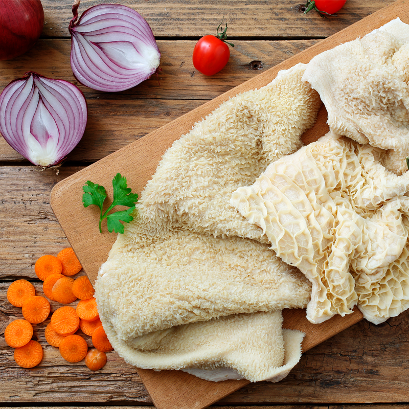 Semi-cooked tripe obtained after cooking, blanching, cooling and draining, preserving all its properties.